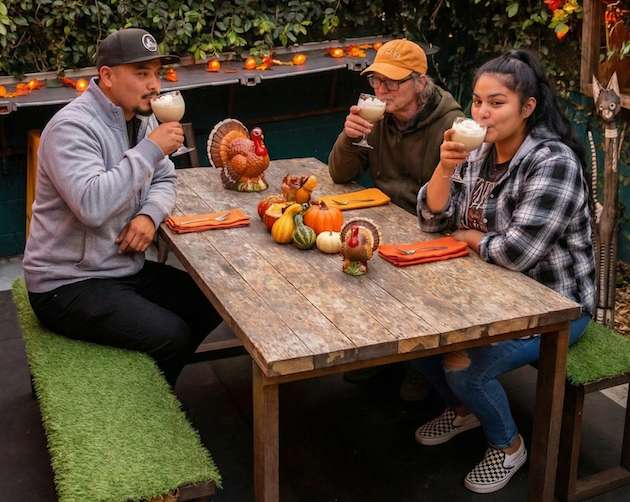 Hollywood transformed into a communal dining room, pods becoming casual seating for Thanksgiving dinner.
